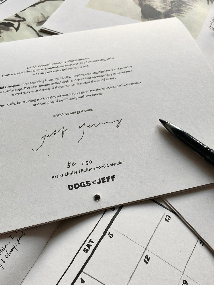 LET'S CELEBRATE! In 2025, I took a huge leap of faith, resigned from my Amazon position to become a full-time dog artist. Almost one year has gone by and I survived! I've learned a lot on this journey and I made beautiful connections all around the world. To celebrate this with all of you who love this project dearly, I made a calendar, with my own handwritings of inspo quotes, and 12 pieces of RAW & REAL artworks from my sketchbooks.